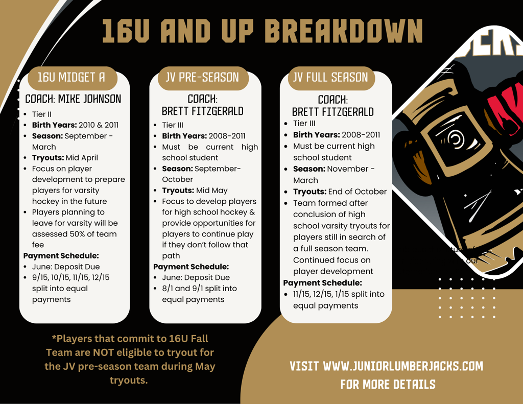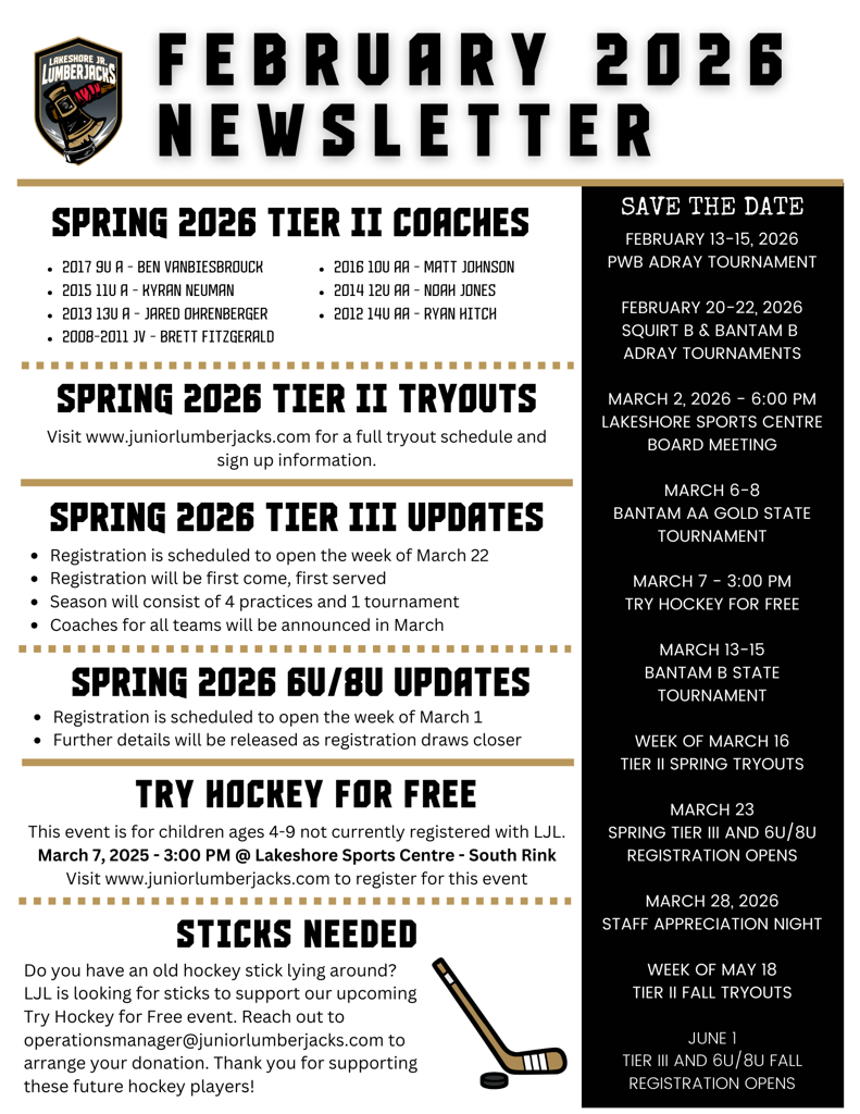 Payment to be made at the time of tryout at the registration table via credit/debit card or in advance at Lakeshore Junior Lumberjacks Payment Link using "Tryout" in invoice ID field.
